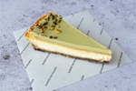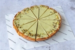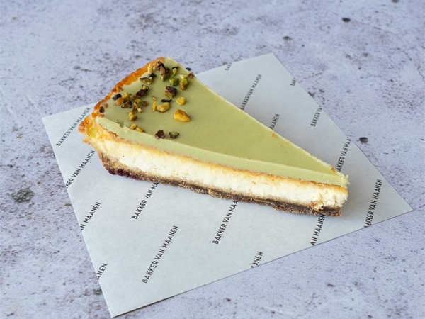 Romige pistache cheesecake met een smaakvolle koekbodem, afgewerkt met pistache creme en pistache nootjes.